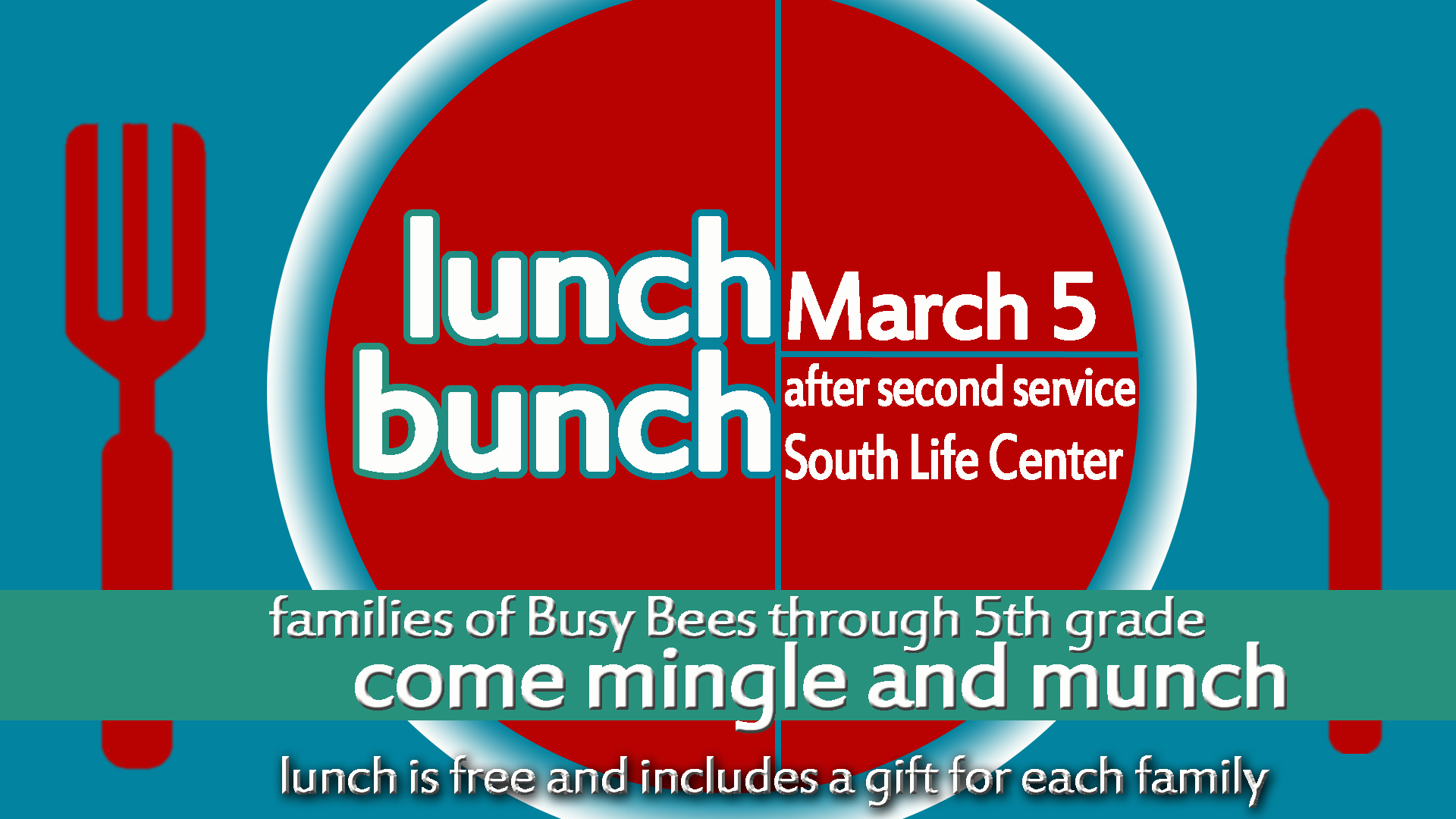 Families, if you have a Busy Bee through 5th grader, you are invited to be part of the LUNCH BUNCH on Sunday, March 5th in the South Life Center. We are celebrating finishing the Old… Continue reading Lunch Bunch
